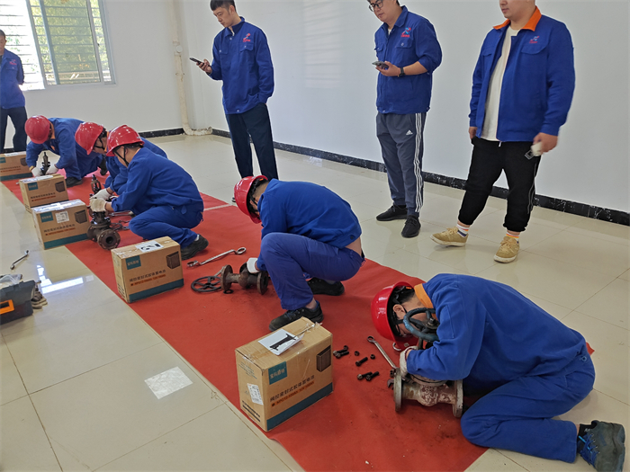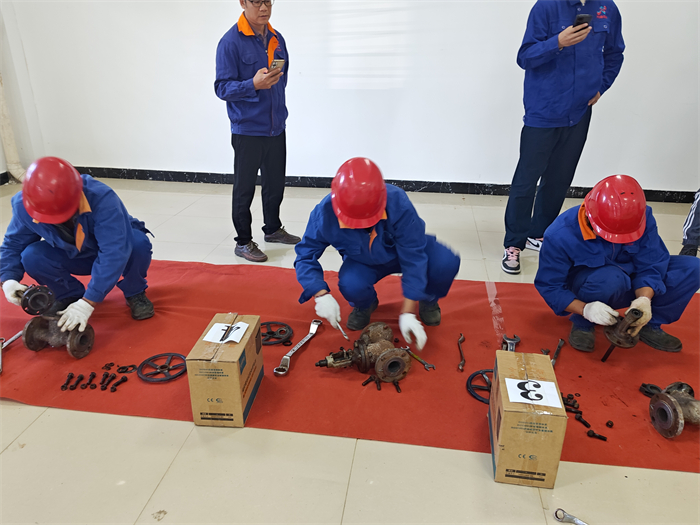 本次比赛首先进行的项目为阀门组装大比拼。该项目对专业技能考核主要参加选手为公司生产一线员工,主要考核对日常阀门检修工作的熟练水平。比赛要求在规定时间内,报名参加的选手经过抽签后,分别对指定的供热管道DN50的阀门的拆卸组装。随着裁判员手掐计时器,大家都神情专注地看着每个选手紧张操作,不时在每个操作台驻足加油,经过分组比拼,两轮角逐后再由生产部部长、副部长进行点评。最后根据综合表现评选出拆装过程规范、用时最少的选手。整场比赛既紧张而又有趣,我们生产部的年轻骨干徐铭泽以熟练的操作技能,老党员葛春明以规范化的零部件摆放,分别在第一项比赛中赢得了第一、第二名的好成绩。