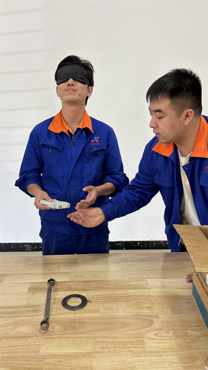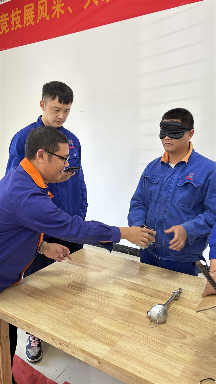 随后开展第二项生产工具大考验。根据提前准备好的日常生产工作的各类工具和管道零部件,要求参赛选手依次蒙上眼睛,由裁判员随机抽取一组(三件)物品排放在桌子上,选手通过触摸桌上物品说出其准确名称,以最快答出的选手获胜。本次项目比拼,生产部班组骨干力量徐铭泽、唐瑜、苏宥仲凭借对日常对生产工具的用心规范熟练快捷发挥,取得前三名的好成绩。